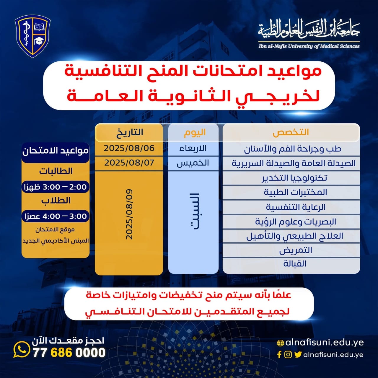 جامعة ابن النفيس للعلوم الطبية – صنعاء اعلان بشأن مواعيد الامتحانات التنافسية للمنح الدراسية في أهم التخصصات الطبية.