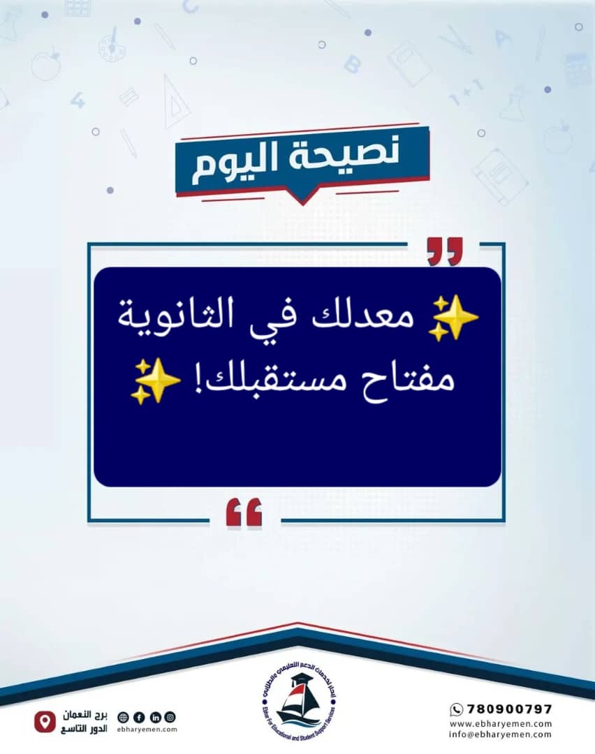 🎯 ولضمان الحصول على المميزات الإضافية #سجّل_الآن عبر منصة إبحار. من خلال الرابط 👇🔗 https://ebharyemen.com/registrationsلمزيد من المعلومات:📲 واتساب مباشر:https://wa.me/+967780900797 لزيارتنا العنوان:شارع هائل برج النعمان الدور التاسع #إبحار – مستشارك التعليمي الذكي… لمستقبل أفضل 🌟المزيد