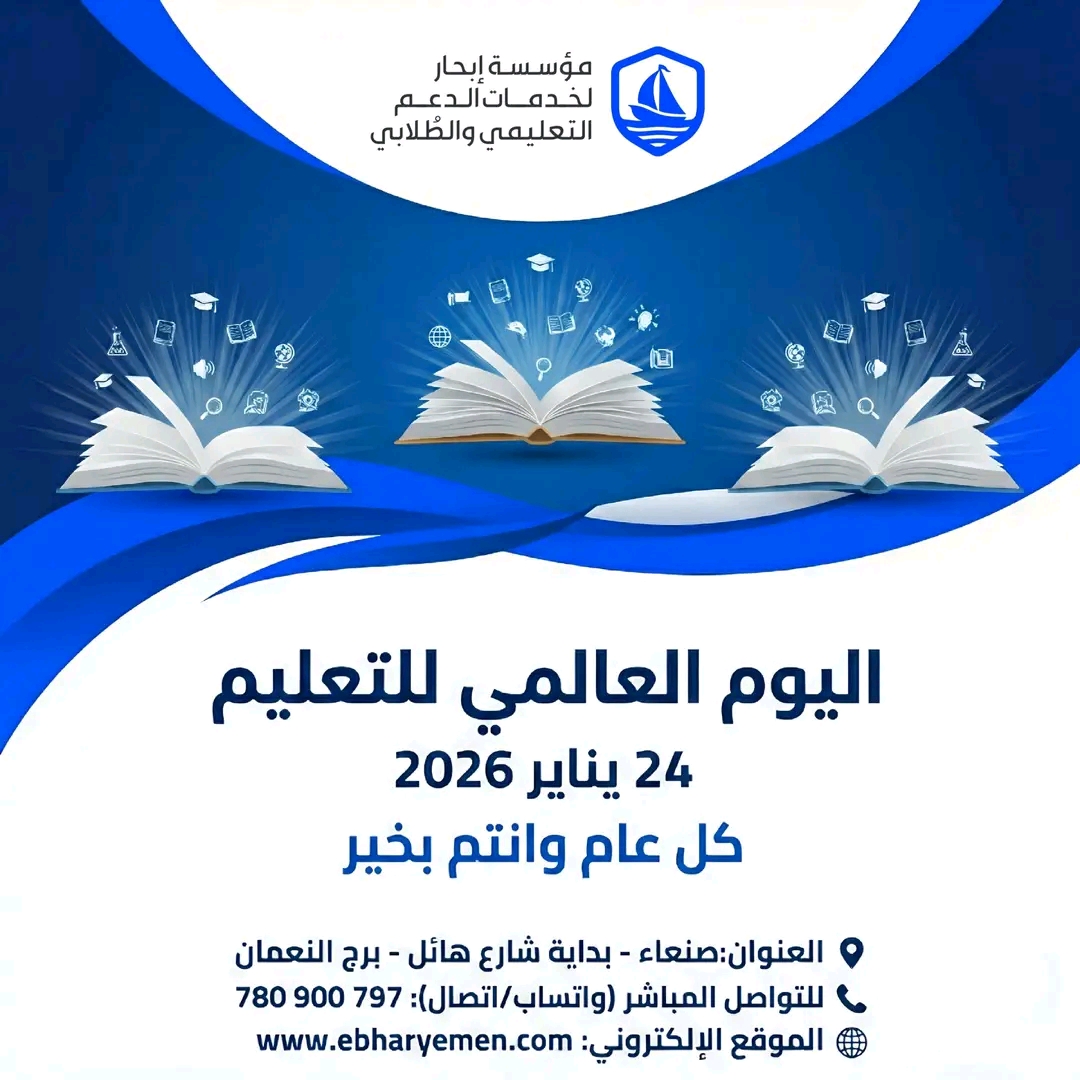 نتوجـه بأسمـى آيـات التهانــي والتقديــر لكـل طالـب يمنـي يطمـح للأفضــل، ولكـل معلــم يبـذل جهـده لإنـارة العقــول. أنتم الأمــــل، وبكـم يزدهــر الوطــــن. 🇾🇪 فـي مؤسســة إبحــــار، نجــدد عهدنــا بأن نكـون السنــد والدعــم الدائــم لمسيرتكــم التعليميــة والأكاديميــة، لنسهــل عليكــم الطريــق نحــو تحقيــق أحلامكــــم. كـل عــــام وأنتــم منــارة للعلــم والمعرفــــة. 🎓💙 📍 تجدونــا فــي: صنعاء – بداية شارع…المزيد