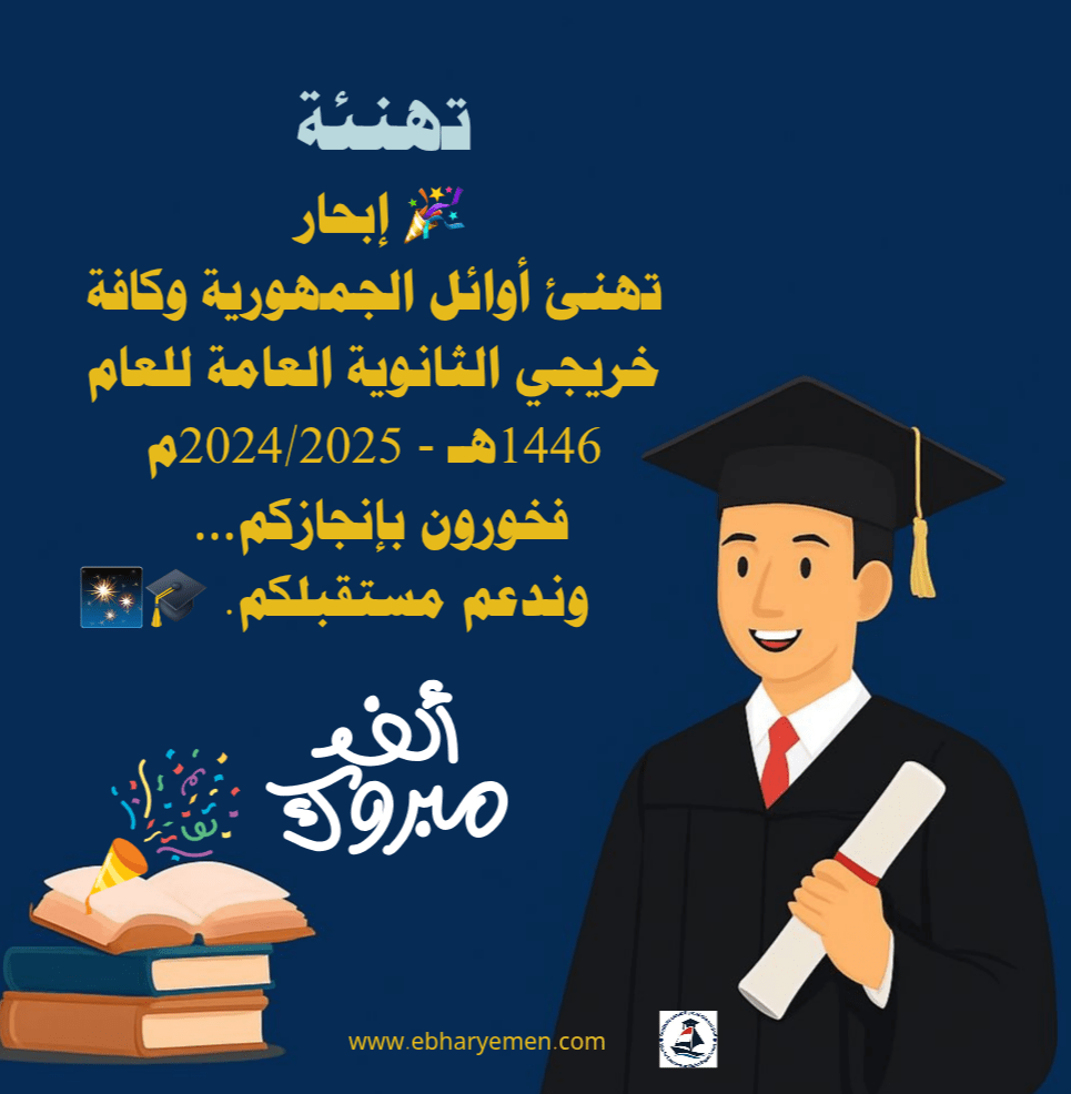 🌟 تتقدم مؤسسة إبحار لخدمات الدعم التعليمي والطلابيبأصدق التهاني والتبريكات لأبنائنا وبناتنا أوائل الجمهورية وكافة الخريجين من الثانوية العامة على هذا الإنجاز العظيم والتفوق المشرف 🎓👏 💐 فخورون بكم، وبمثابرتكم، وبأنكم نموذج يُحتذى به لجيل المستقبل.نسأل الله لكم دوام التوفيق في مسيرتكم الجامعية والحياتية. 📌 ويسعدنا أن نكون جزءاً من رحلتكم القادمة من خلال تقديم…المزيد