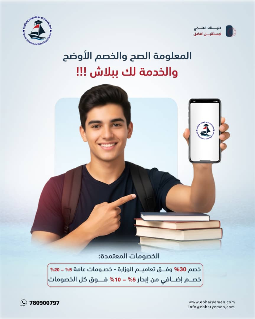 🎓 الخصومات المعتمدة في الجامعات والكليات الأهلية:📌 خصم 30% بحسب تعاميم الوزارة.📌 خصومات إضافية من 5% إلى 20% حسب السياسة المعتمدة لكل كلية او جامعة.📌 والأهم: خصم إضافي خاص من إبحار بنسبة 5% – 10% فوق كل الخصومات 🎯 لأن الثقة أهم من الضجيج🎯 ولأننا نوصلك لما تستحق فعلاً 🎓 مع إبحار… القرار أوضح، الطريق…المزيد