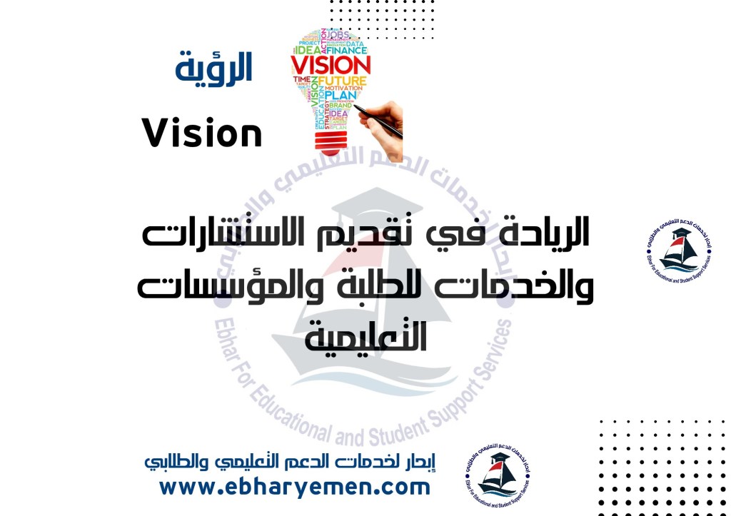 الرؤية : الرؤية (Vision) : الريادة في تقديم الاستشارات والخدمات للطلبة والمؤسسات التعليمية. شارك هذا الموضوع: إبحار لخدمات الدعم التعليمي والطلابي النقر للمشاركة على X (فتح في نافذة جديدة) X انقر للمشاركة على فيسبوك (فتح في نافذة جديدة) فيس بوك انقر للمشاركة على Telegram (فتح في نافذة جديدة) Telegram انقر للمشاركة على WhatsApp (فتح في نافذة جديدة) WhatsApp النقر لإرسال رابط عبر البريد الإلكتروني إلى صديق (فتح في نافذة جديدة) البريد الإلكتروني اضغط للطباعة (فتح في نافذة جديدة) طباعة إعجاب تحميل...